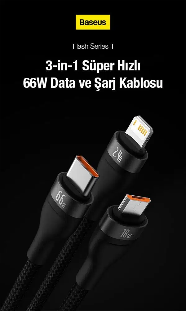 EtiketlerBaseus Flash Series II 66W 3in1 iPhone Type-C Hızlı Şarj Kablosu 1.2m