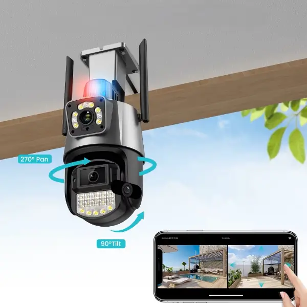 ÇAKARLI ÇİFT LENSLİ DIŞ MEKAN GÜVENLİK KAMERASIÜrün Özellikleri Çakarlı çift lensli dış mekan güvenlik kamerası, yüksek çözünürlüklü 8MP görüntü kalitesiyle profesyonel güvenlik çözümleri sunar. Çift lens tasarımı sayesinde geniş açılı ve detaylı görüntü sağlar. Gece görüş özelliği ile düşük ışıkta bile net kayıt yapabilir ve tam renkli gece görüntüleme desteğiyle güvenliği en üst seviyeye taşır. Çakarlı alarm özelliği sayesinde şüpheli durumlarda görsel ve işitsel uyarı verir. Çift yönlü ses desteği sayesinde kamera üzerinden karşılıklı iletişim kurulabilir. IP66 su geçirmezlik standardına sahip olan kamera, yağmur, kar ve toz gibi zorlu hava koşullarında sorunsuz çalışır. Hareket algılama özelliği ile anında mobil cihazlara bildirim gönderir ve Bluetooth desteğiyle hızlı bağlantı imkânı sunar. PTZ kontrol desteği sayesinde 355° yatay ve 90° dikey açıyla çevreyi eksiksiz izleyebilirsiniz. Paket İçeriği 1 adet Çakarlı Çift Lensli Dış Mekan Güvenlik Kamerası