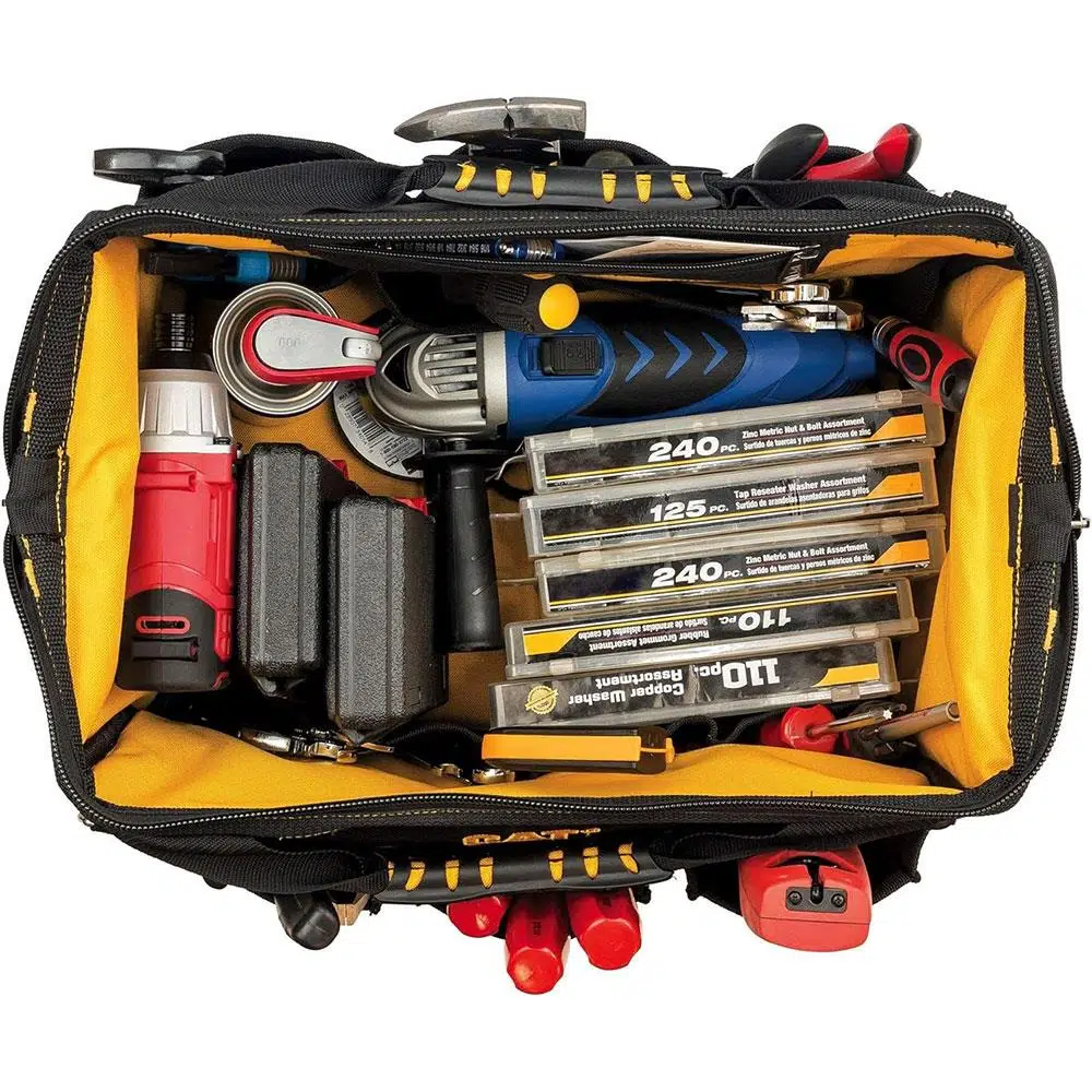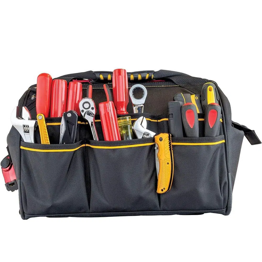 CAT 16'' geniş ağızlı ağır hizmet tipi alet takım çantası maksimum alet taşıma kapasitesi için toplam 18 + 1 açık cep ve geniş düz ve düzenli bir iç alana sahiptir.