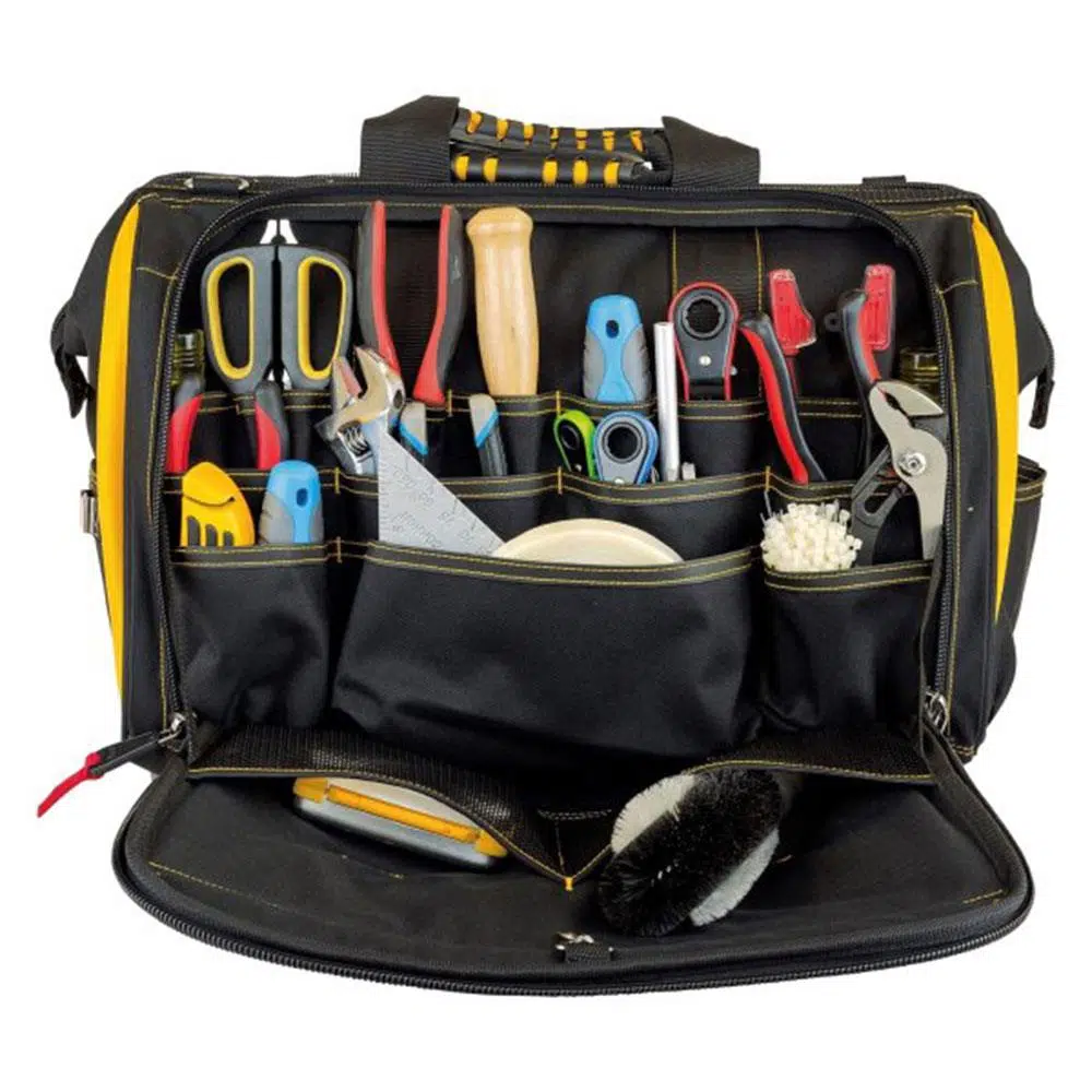 Geniş ana saklama bölmesi elektrikli el aletlerini, kabloları, telleri, şarj cihazlarını, ölçüm cihazlarını ve daha fazlasını kolayca saklayabilmek içindir. Not defterleri, kılavuzlar ve diğer ince eşyaları saklamak için 2 yan cebe sahiptir.