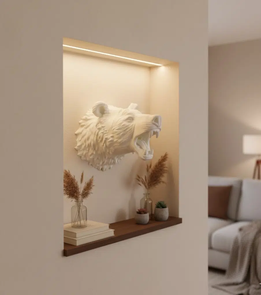 Beyaz 3D ayı başı duvar heykeli, dekorasyonuna modern, etkileyici ve güçlü bir dokunuş eklemek isteyenler için özel olarak tasarlanmış bir üründür. 25x19 cm ölçülerindeki bu dekoratif figür, beyaz renginin sadeliği ve şıklığı ile hem modern hem de minimal dekorasyon tarzlarına mükemmel uyum sağlar. Ürünün detaylı yüz hatları dikkat çekici bir gerçekçilik sunarken, 3 boyutlu kabartı yapısı duvarda güçlü bir gölge etkisi oluşturur.Hafif ve sağlam yapısı sayesinde kolayca duvara monte edilebilir. Odanın odak noktası olması için tek başına kullanılabileceği gibi, galeriler, çalışma odaları, genç odaları, ofisler veya tasarım ağırlıklı ortamlar için de harika bir tamamlayıcıdır. Ayı figürü; güç, cesaret ve koruyucu enerji ile ilişkilendirildiği için manevi anlamda bir sembol arayan kullanıcıların da ilk tercihleri arasında yer alır.Es tasarımı sayesinde fotoğraf çekimleri, video çekim alanları, stüdyo dekorasyonları veya mağaza vitrinlerinde de çok şık bir görünüm sağlar. Beyaz rengi, her renkteki duvar ile uyumlu olduğu için dekorasyon seçeneklerini genişletir.Ayrıca özel günler için benzersiz bir hediye seçeneğidir. Şık, farklı ve anlamı olan dekoratif objeler sevenler için ideal bir alternatiftir.