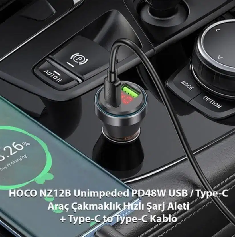 EtiketlerHOCO NZ12B Unimpeded PD48W USB + Type-C Araç Çakmaklı Hızlı Şarj Aleti + Type-C to Type-C Kablo Turuncu