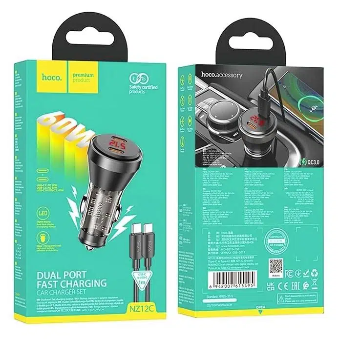 EtiketlerHOCO NZ12C Graceful PD60W 2 Type-C Girişli Araç Çakmaklık Hızlı Şarj Aleti + Type-C to Type-C Kablo