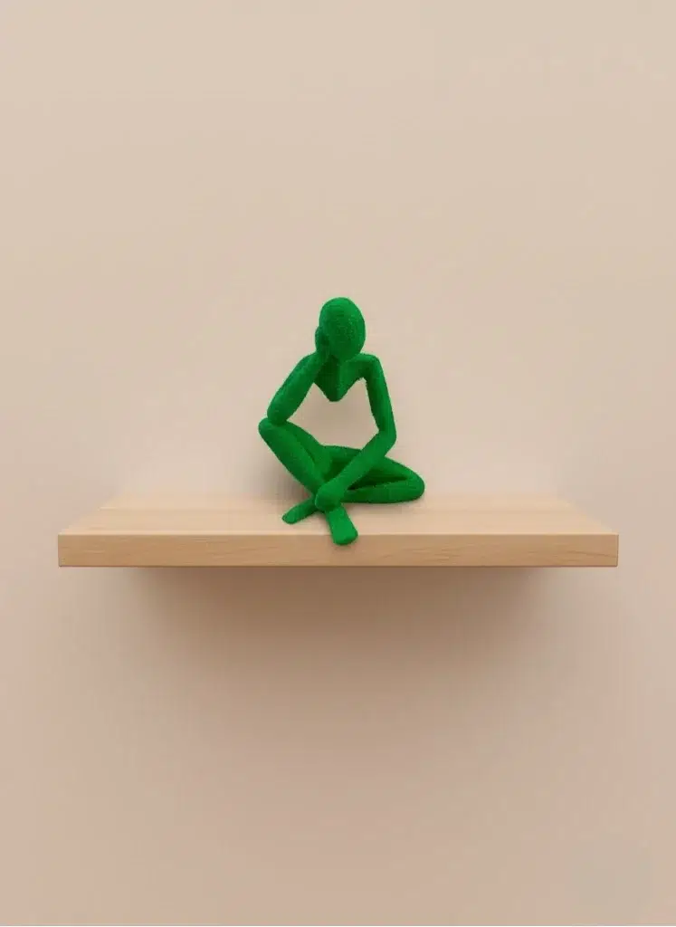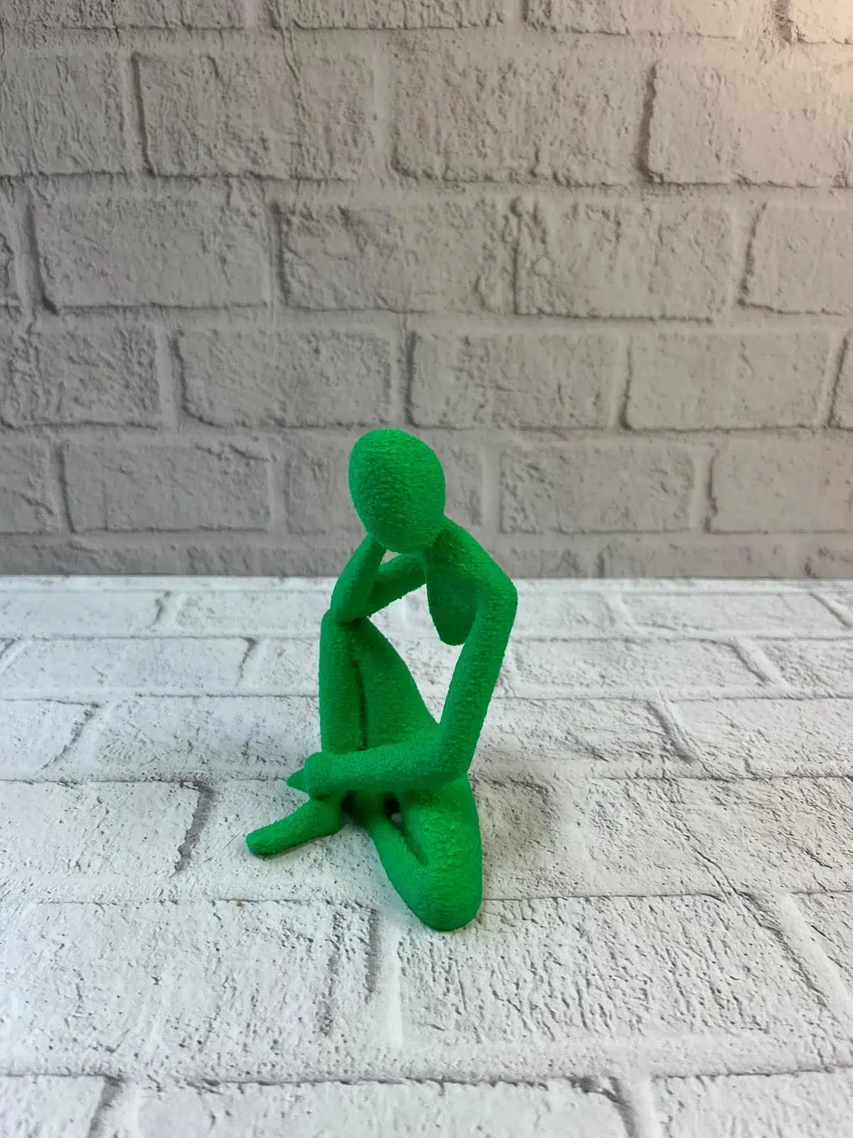 Yeşil insan figürü biblo, düşünceli pozuyla dekorasyona karakter katar. Küçük boyutları sayesinde dar alanlarda bile şık bir tamamlayıcı olarak kullanılabilir. Evde, ofiste veya çalışma alanlarında masa üstü ya da raf dekoru olarak tercih edilebilir. Minimal tasarımı, loş ya da aydınlık ortamlarda es bir duruş sergiler ve dekorasyona modern bir hava kazandırır.