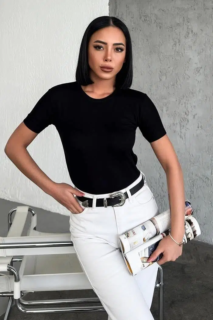 -Bu harika kısa kollu bisiklet yaka likralı siyah viskon penye body, gardırobunuzun vazgeçilmez parçalarından biri olmaya aday! Klasik şıklığı ve rahatlığı bir araya getiren bu body, her an tarzınızı yansıtabilir ve kendinizi özgür hissettirecek.