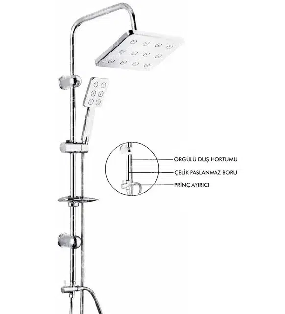 • Robot Duş Seti Krom Dikdörtgen | Çok Fonksiyonlu Yağmur Robot Duş Sistemi Dikdörtgen Krom Lora 25 mm paslanmaz krom boru Kromlu ABS tepe ve el duşu 150 cm den 180 cm ye uzayabilen, çift kenetli, EPDM iç hortumu, Uçları ve somunları pirinç, kromlu paslanmaz çelik duş hortumu, Pirinç yönlendirici Krom kaplama ABS kurulum ekipmanı