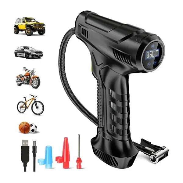ŞARJLI EL TİPİ HAVA KOMPRESÖRÜÜrün Özellikleri Şarjlı el tipi hava kompresörü kompakt yapısıyla kolay taşınabilir ve pratik kullanım sağlar. 3600 mAh bataryaya sahip olan cihaz, güçlü 120 W motoru sayesinde hızlı şişirme imkanı sunar. Dijital ekranlı tasarımıyla basınç değerlerini net bir şekilde gösterir ve kullanım kolaylığı sağlar. Araç lastikleri, bisiklet, motosiklet, top ve çeşitli şişme ürünlerde rahatlıkla kullanılabilir. USB üzerinden şarj edilebilir yapısıyla enerji tasarrufu sunar ve farklı uç adaptörleri sayesinde çok yönlü bir kullanım sağlar. Paket İçeriği1 adet Şarjlı El Tipi Hava Kompresörü