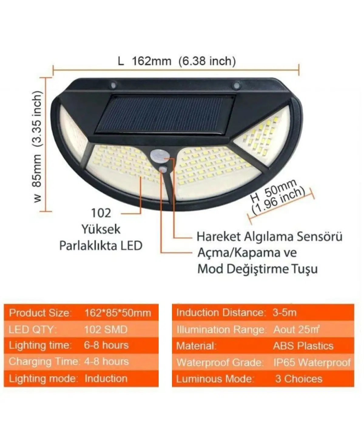• 1 adet Sepetegelsin Solar Güneş Enerjili 102 Ledli 3 Modlu Hareket Sensörlü Bahçe Lambası