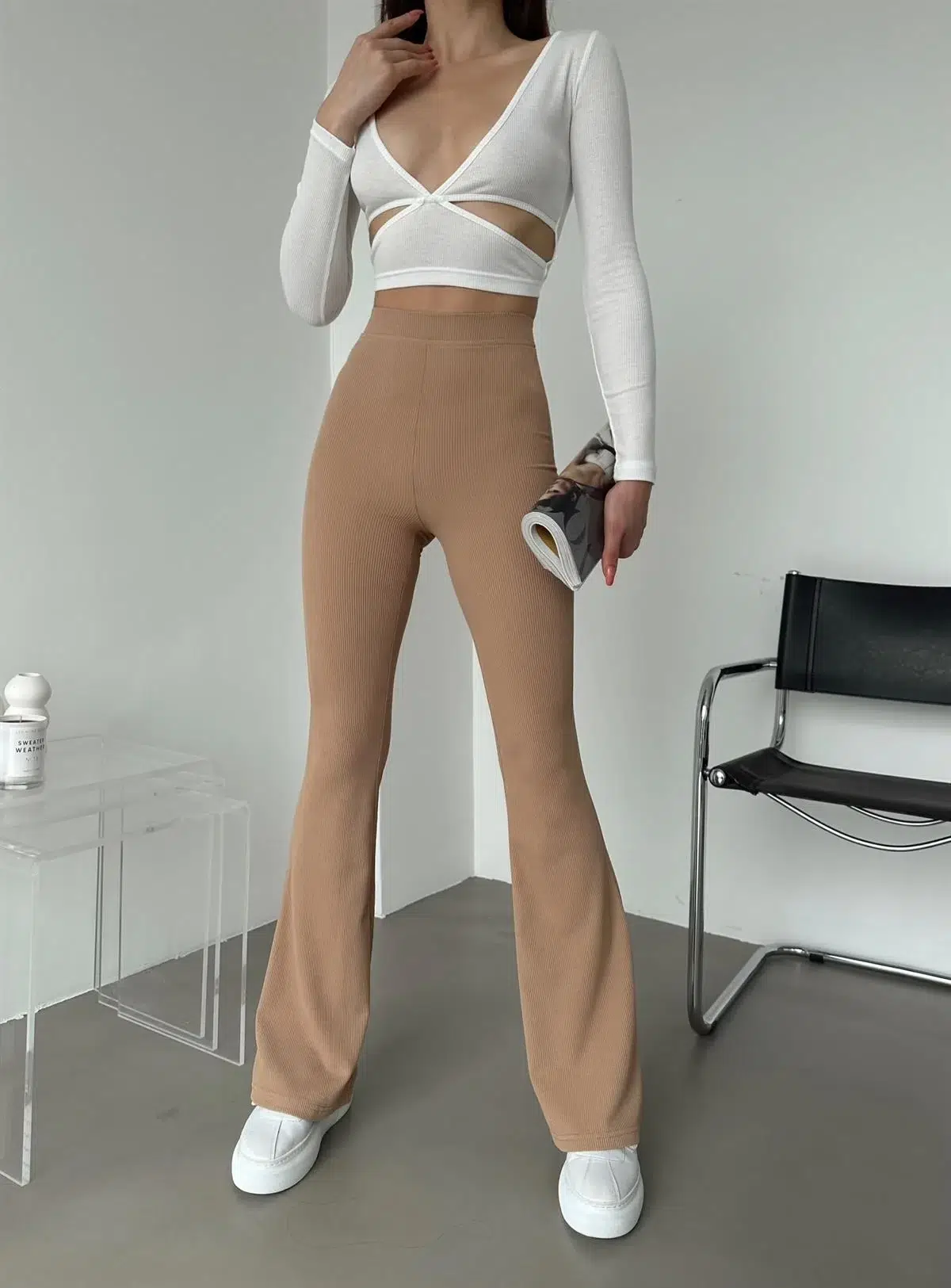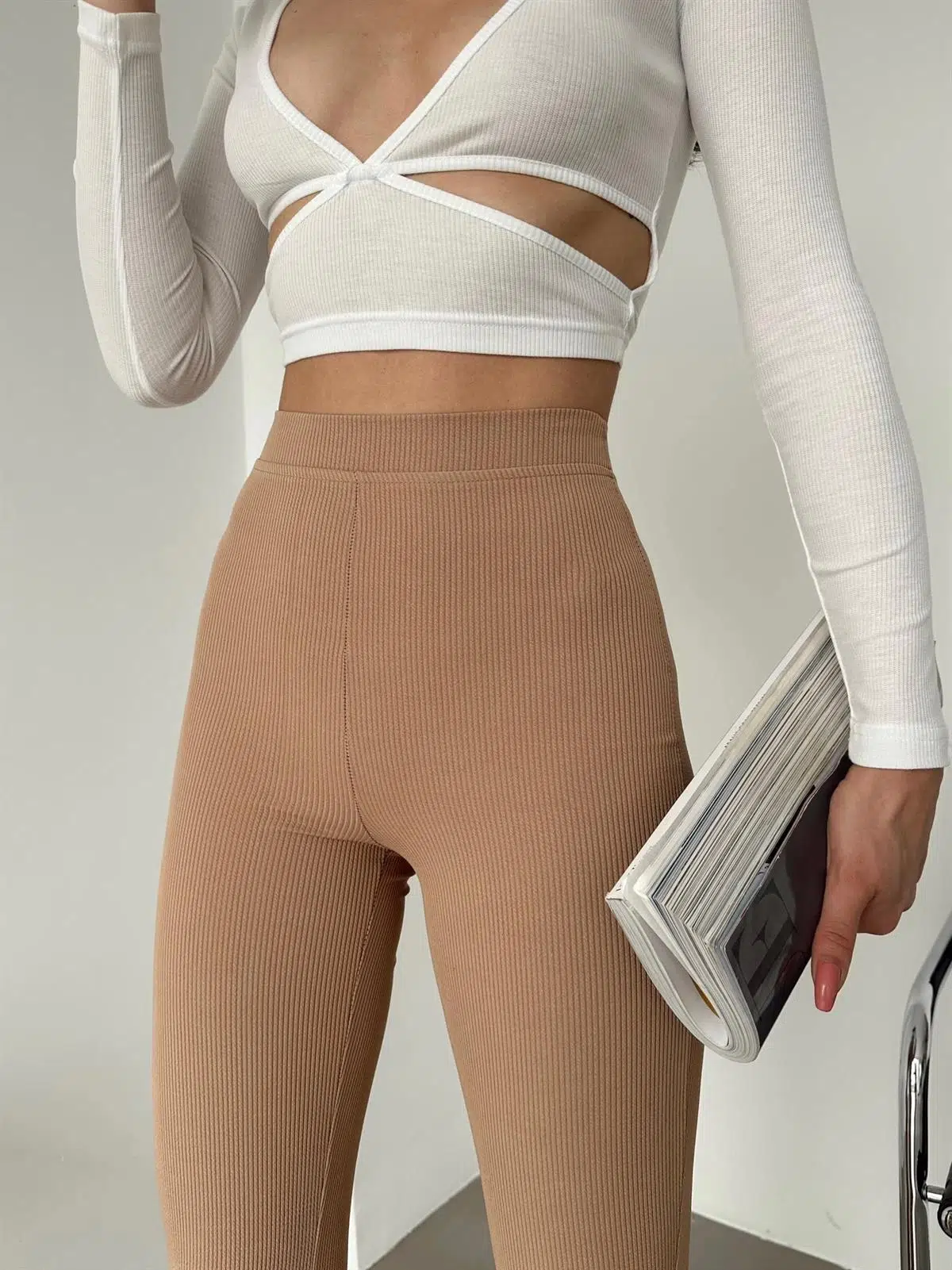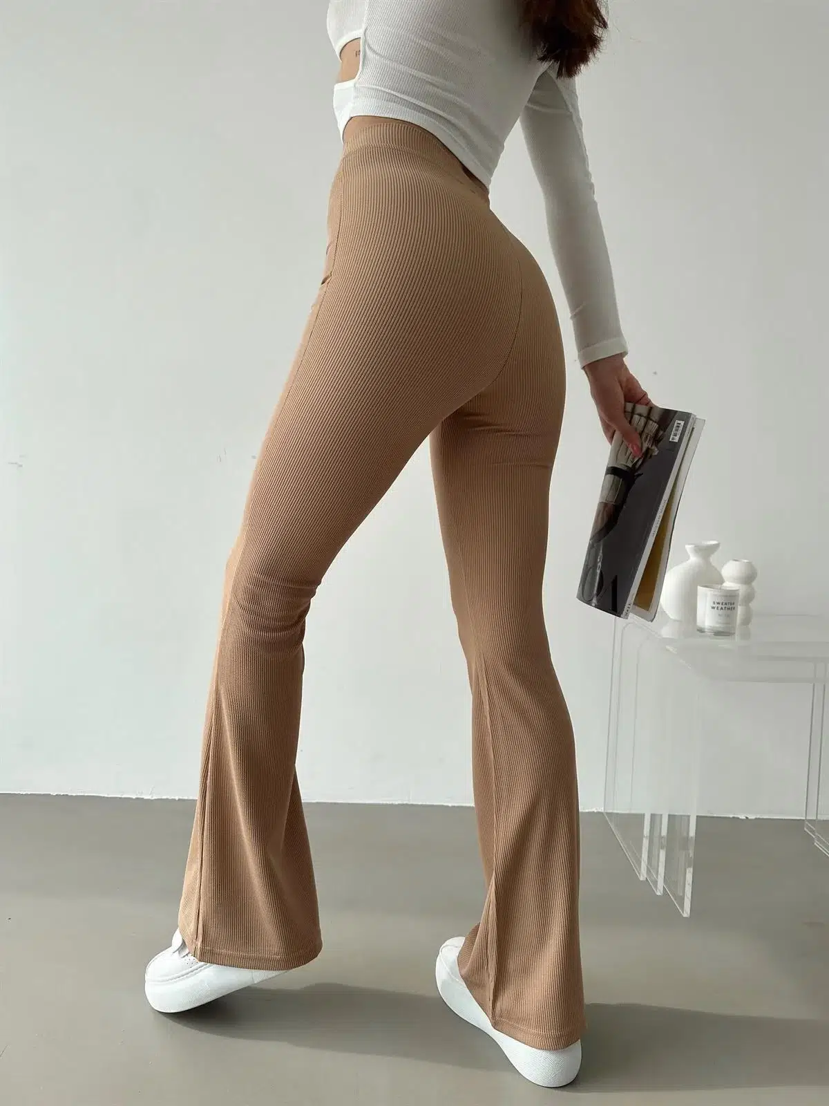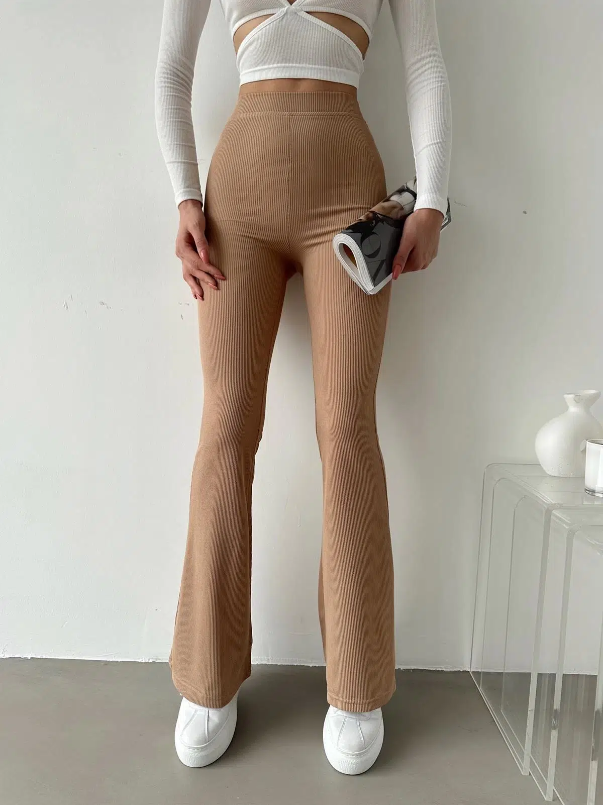 EtiketlerŞık Ve Rahat Yüksek Bel İspanyol Paça Fitilli Toparlayıcı Bej Tayt