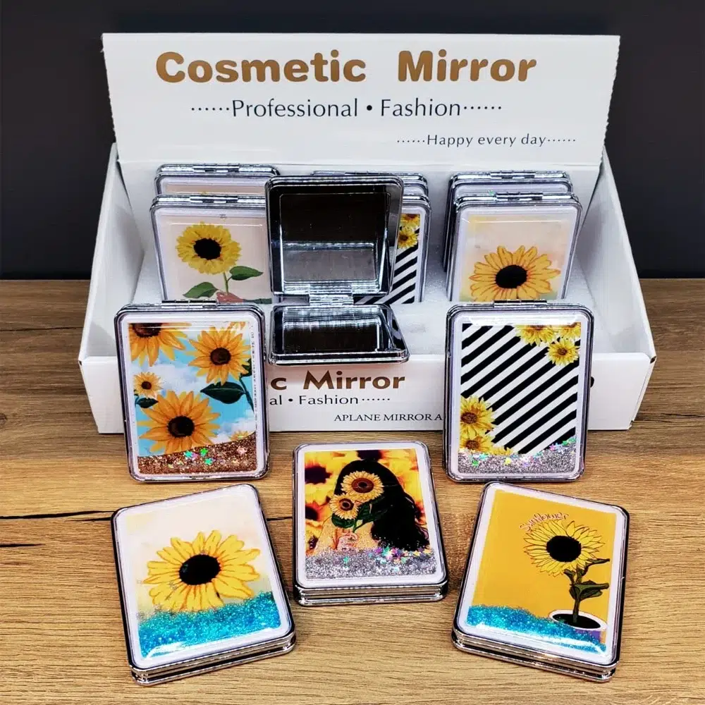 SİMLİ KAPAKLI CEP AYNASIÜrün ÖzellikleriSimli Kapaklı Cep Aynası, kaliteli cam malzemeden üretilmiştir. Aynanın kapağı plastik malzemeden yapılmış olup, içerisinde su ve simler yer almaktadır. Kapağındaki ayçiçeği tasarımlı baskılar ile şıklık katılmıştır. Bu pratik ve estetik ayna, özel günlerde kullanılabilecek harika bir hediye seçeneğidir. Aynaların tasarımları olarak gönderilmektedir, bu da ürünün her seferinde farklı bir modelle gelmesini sağlar. Ürünün boyutları ise 8.5 cm x 6 cm'dir.Paket İçeriği1 Adet Simli Kapaklı Cep Aynası