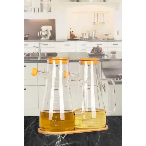 STANDLI 2'Lİ CAM YAĞDANLIKÜrün ÖzellikleriStandlı 2'li Cam Yağdanlık, şık ve fonksiyonel tasarımı ile mutfaklarınıza zarif bir dokunuş katar. Borosilikat cam malzeme ile üretilmiştir ve 900 ml kapasiteye sahiptir. Silikon uçları sayesinde sızdırmazlık sağlar ve kullanım sırasında kolayca kontrol edilebilir. 2 adet olarak sunulan bu set, yemeklerinizde ya da salatalarınızda doğru miktarda yağ dökmenizi sağlar. Ahşap kapakları ise estetik ve doğallığı bir araya getirir. Ayrıca, her iki yağdanlık da üzerinde ölçü birimleri ile işaretlenmiştir, böylece ihtiyacınız olan miktarı daha rahat ayarlayabilirsiniz.Paket İçeriği1 Adet Standlı 2'li Cam Yağdanlık