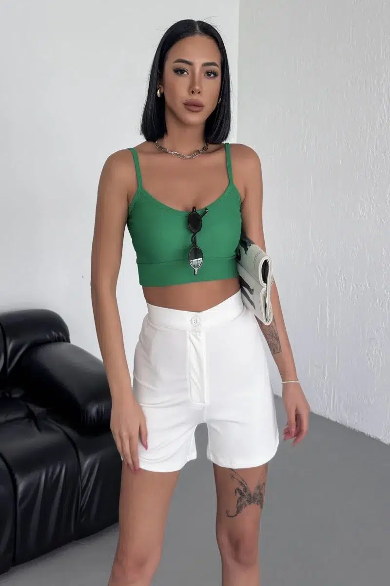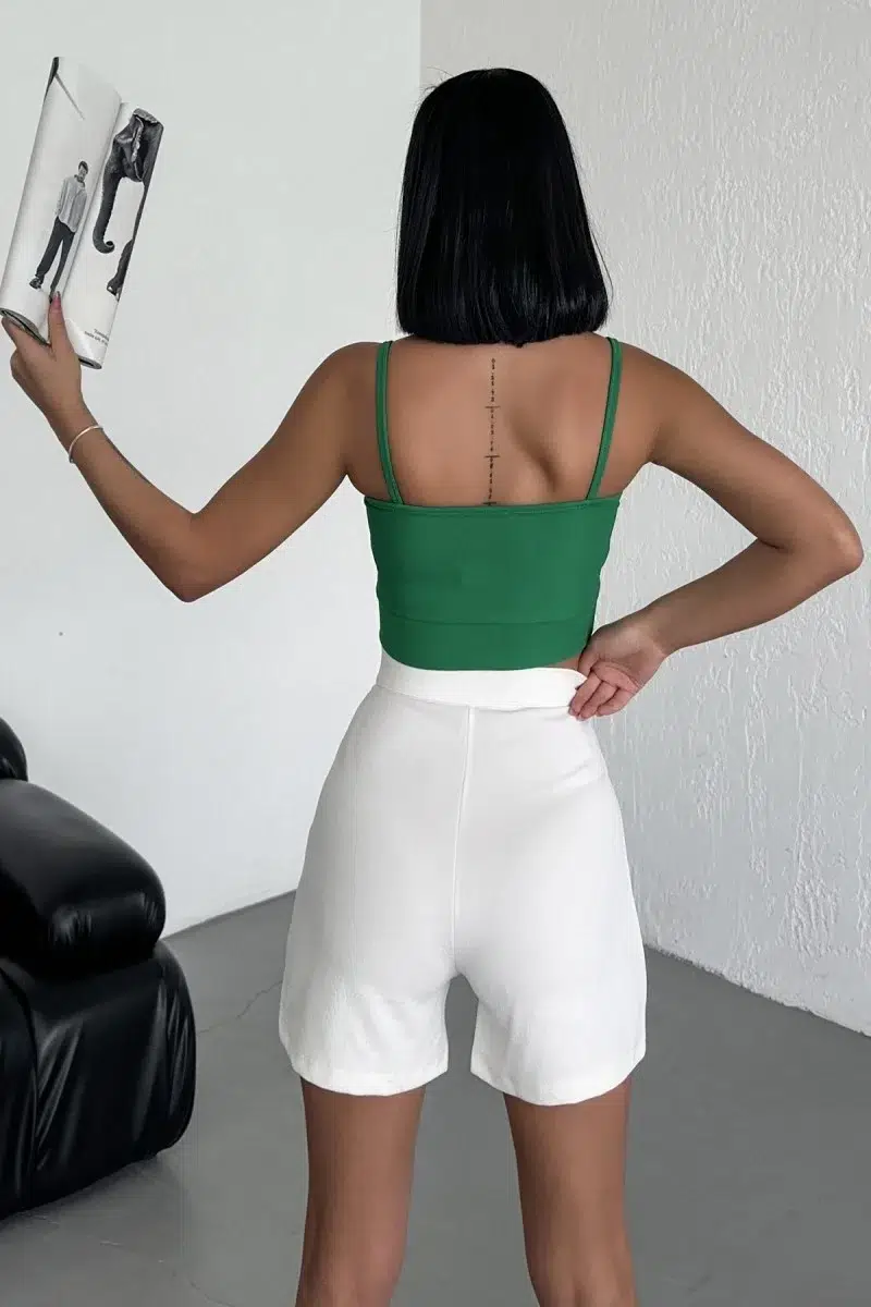 -Yazın serin ve hafif hissetmek isteyenler için ideal olan bu beyaz yüksek bel esnek krep şort, stil ve konforu bir araya getirerek sizin için mükemmel bir seçenek!