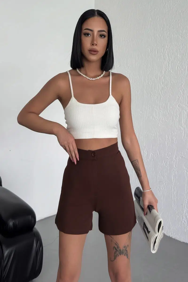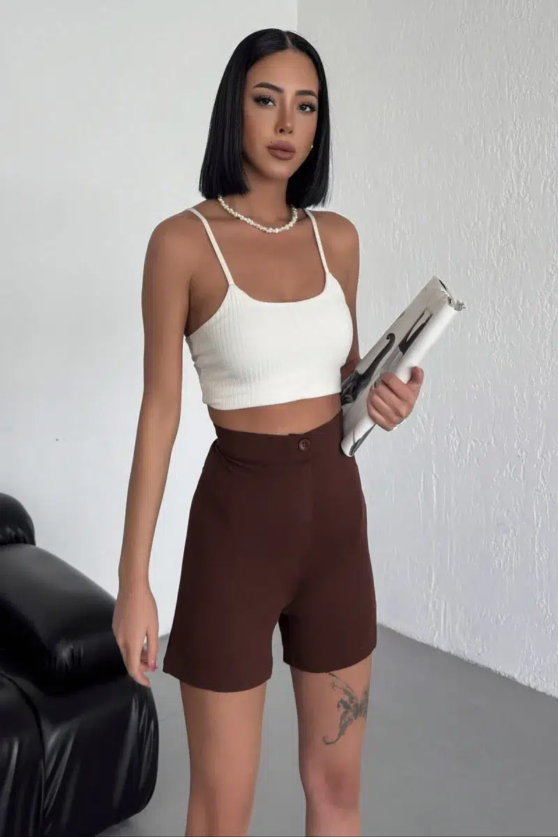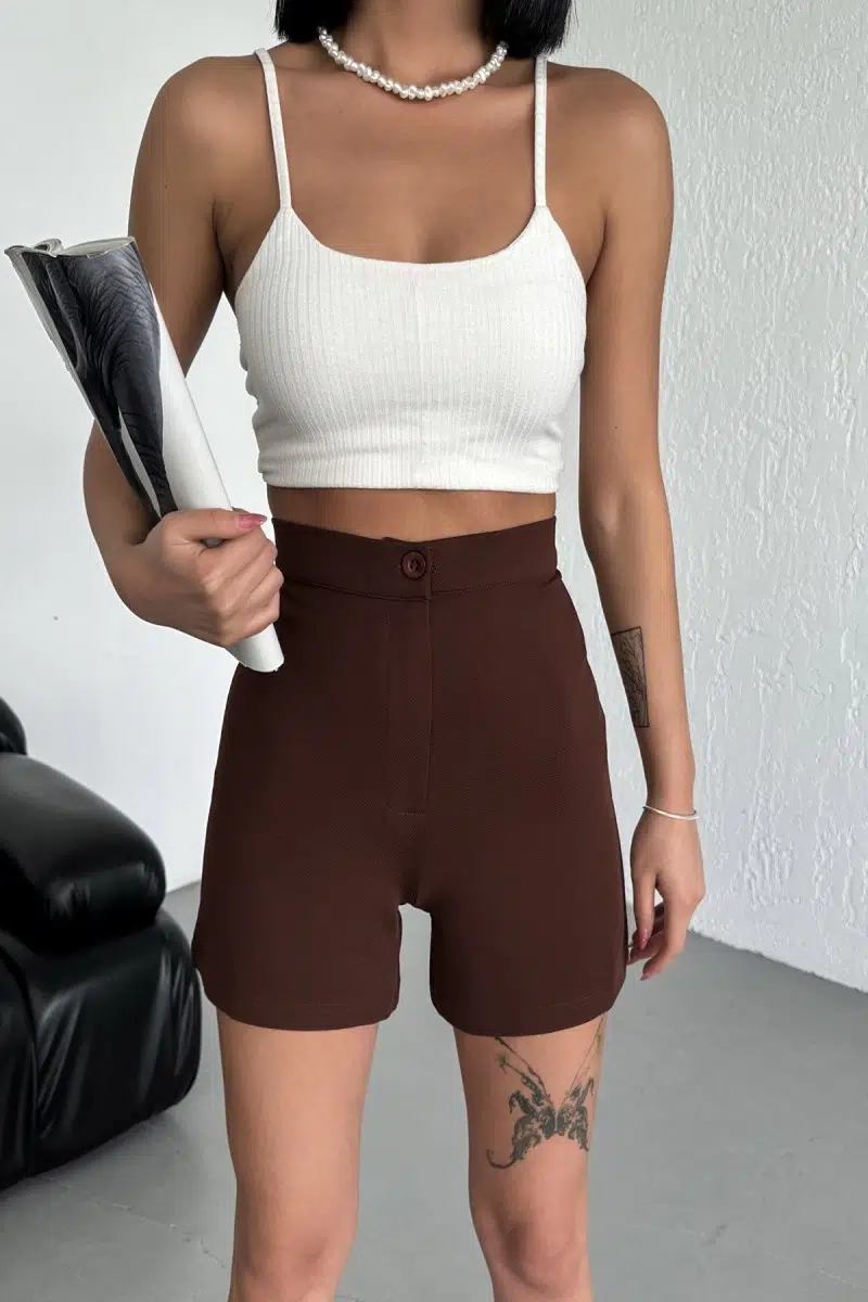 EtiketlerTarz Ve Rahatlığı Bir Arada Sunan Yüksek Bel Esnek Likralı Krep Şort Kahverengi