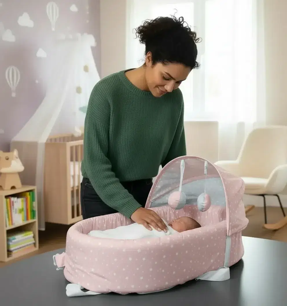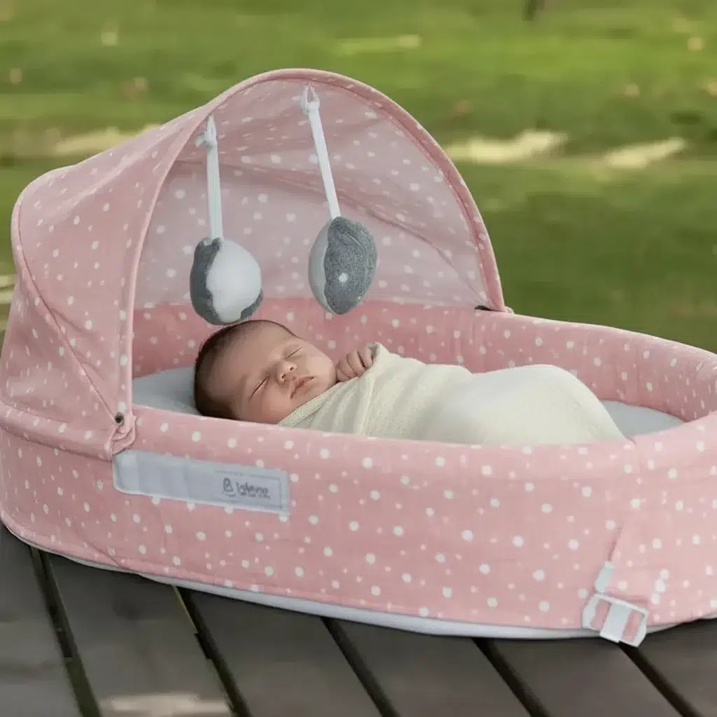 Taşınabilir Portatif Bebek Yatağı,Sırt Çantasına Dönüşebilen Portatif Bebek Beşiği (Pembe)