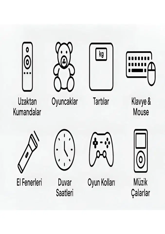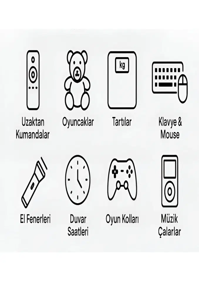 Kumandalar, kablosuz klavye/mouse, oyuncaklar, fenerler, el cihazları, fotoğraf ekipmanları ve 1.5V pil kullanan tüm elektronik ürünler için uygundur.