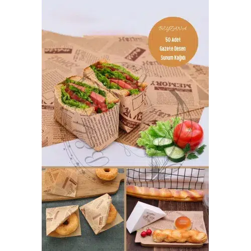 VINTAGE GAZETE DESENLİ SUNUM KAĞIDI 50 ADETZamansız Şıklık ve PratiklikYemek sunumunuza nostaljik bir dokunuş katın ve sunumlarınızı benzersiz kılın! Vintage gazete desenli sunum kağıdı, hem göz alıcı bir estetik sunar hem de kullanım kolaylığı sağlar. Bu özel tasarım yağlı kağıt, dayanıklı yapısı ve su geçirmez özelliği sayesinde sandviç, hamburger ve diğer lezzetli yiyeceklerinizi güvenle sararak sunmanızı mümkün kılar. Retro gazete desenleri ile sofralarınıza klasik bir hava katan bu ürün, aynı zamanda hijyenik ve gıda temasına uygun malzemelerden üretilmiştir.Yemek sunumu konusunda yenilikçi çözümler arayanlar için ideal olan bu sunum kağıdı, kafe, restoran ve ev kullanımı için mükemmel bir seçimdir. Sandviçlerinizi, kurabiyelerinizi ve diğer aperatiflerinizi bu şık kağıtlarla sarmak, misafirlerinize ve müşterilerinize unutulmaz bir deneyim sunmanızı sağlar. Kolayca katlanabilir ve kesilebilir yapısıyla pratik bir kullanım sunan vintage gazete desenli sunum kağıdı, aynı zamanda çevre dostu ve geri dönüştürülebilir materyallerden üretilmiştir.Sofralarınıza geçmişin büyüsünü taşıyan bu zarif ürün, stil ve işlevselliği bir araya getirerek, yemek sunumunuza farklı bir boyut kazandırır. Özel etkinliklerde, günlük sunumlarda ya da paket serviste rahatlıkla kullanabileceğiniz vintage gazete desenli sunum kağıdı, mutfağınızın vazgeçilmez bir parçası olacak. Nostaljinin şıklığını ve pratikliğini bir arada sunan bu eşsiz kağıtlarla, yemek sunumlarınızı sıradanlıktan çıkarın ve her anınızı özel kılın.Paket İçeriği50 adet vintage gazete desenli sunum kağıdı