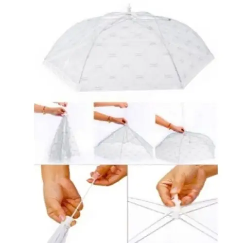 YEMEK KORUMA ŞEMSİYESİ Ürün Özellikleri Yemek koruma şemsiyesi, 60 cm çapında ve 25 cm yüksekliğinde, yemeklerinizi dış etkenlerden korumak için tasarlanmıştır. Özellikle açık alanlarda veya pikniklerde yemeklerinizi toz, böcek ve diğer yabancı maddelerden korur. Şeffaf tül malzeme sayesinde içeriyi net bir şekilde görebilirsiniz. Katlanabilir yapısı ile kolayca taşıyabilir ve saklayabilirsiniz. Hijyenik bir kullanım sağlayarak yemeklerinizi güvenle korur. Çeşitli dış mekan etkinliklerinde kullanıma uygundur. Paket İçeriği 1 Adet Yemek Koruma Şemsiyesi