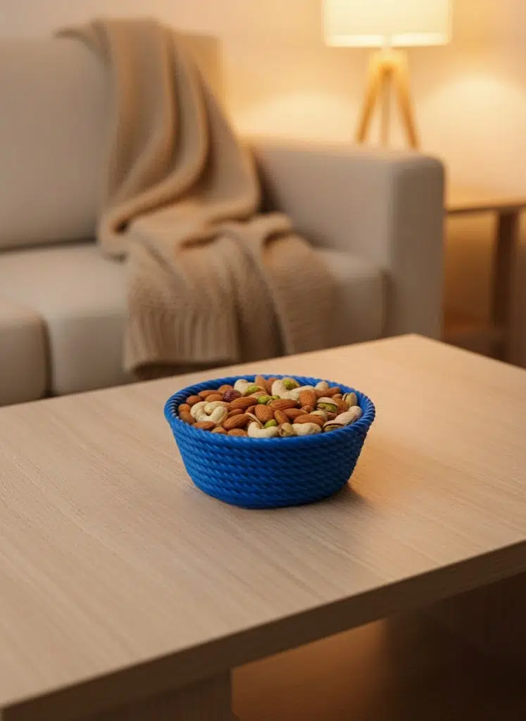 Yuvarlak Çerezlik Lacivert 4×12 cm ölçüsüyle salon, mutfak ve sehpa üstü kullanımlar için ideal bir dekoratif sunum ürünüdür. Kompakt boyutu sayesinde fazla yer kaplamadan çerez, kuru yemiş, draje ve küçük atıştırmalıkların şık şekilde servis edilmesini sağlar. Lacivert rengi bulunduğu ortama modern ve zarif bir dokunuş katar.Örgü dokulu dış yüzeyi ürüne hem es hem de dekoratif bir karakter kazandırır. Günlük kullanımda olduğu kadar misafir sunumlarında da tercih edilebilir. Salon sehpaları, orta masa, yan sehpa ve raf üstlerinde rahatlıkla konumlandırılabilir. Hafif yapısı sayesinde kolay taşınır ve farklı alanlarda pratik kullanım sunar.Çerez, fındık, badem, leblebi gibi kuru yemişlerin yanı sıra şekerleme ve lokum sunumlarında da kullanılabilir. Modern, bohem ve sade dekorasyon tarzlarıyla uyum sağlar. Lacivert rengi sayesinde açık ve koyu tonlu mobilyalarla dengeli bir görünüm oluşturur.