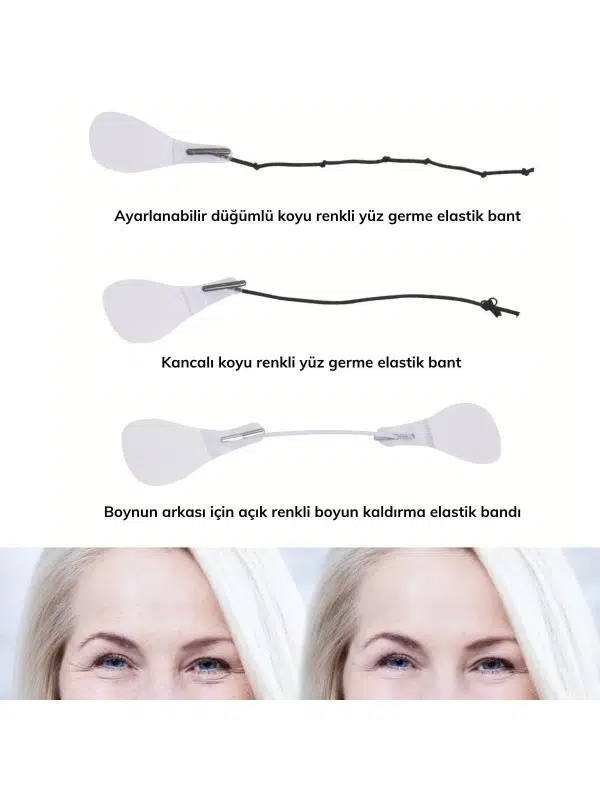 Lastikli Yüz Kaş Göz Boyun Gerdirme Bantları (40 Adet)Ürün Özellikleri:V Şekilli Bir Yüz için: Yüz germe pedleri, iyi esnekliğe sahip su geçirmezdir ve cildinizi rahatsız etmez. V şeklinde bir yüz oluşturmak için cildinizi kaldırabilir ve sıkılaştırabilir.Yumuşak ve Rahat: 40 adet hipoalerjenik yüz germe bantları vardır ve bunlar çevre dostu silikon kauçuk malzemelerden yapılmıştır, kullanımı güvenlidir, sağlıklı, yumuşak ve rahattır.Mükemmel Yüz Germe: Yüz ve boyun germe seti, gevşek cildi iyileştirir ve yüz, boyun, çene ve göz bölgesindeki kırışıklıkları ortadan kaldırır.Daha Genç Olun: Yüz germe bandı, sarkan yüz kaslarını germeye yardımcı ve yüzünüzü şekillendirmeye yardımcıdır. İlk kullanımla beraber daha genç görünecek ve harika hissedeceksiniz.Geniş Uygulamalar: Yüz germe bandı özel günler, düğünler, toplantılar, modellik, fotoğraf çekimi, seyahat vb. için idealdir. İnce, sıkı ve güzel bir yüzün şekillendirilmesine yardımcı olur.Malzeme: Silikon,kauçukRenk: şeffafPaket İçeriği:40 adet Yüz Germe Bandı ve Kademeli Uygulama Lastikleri
