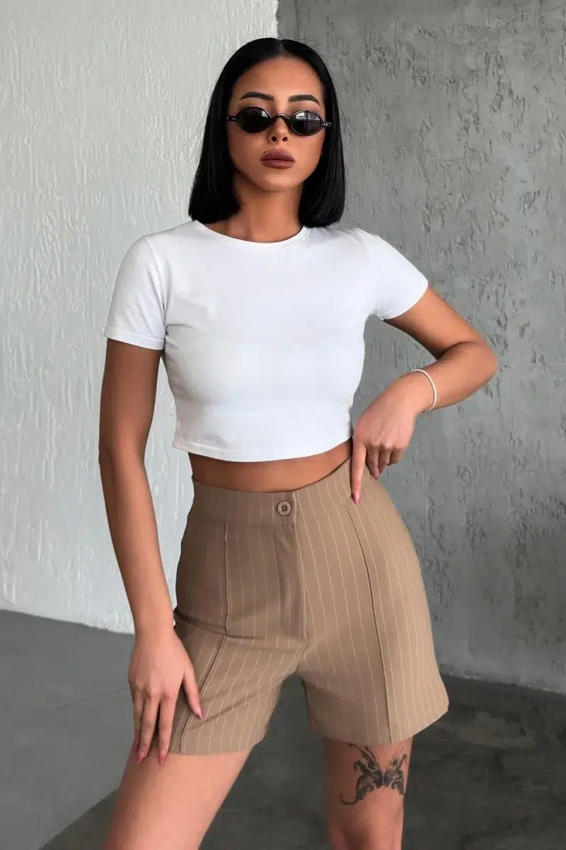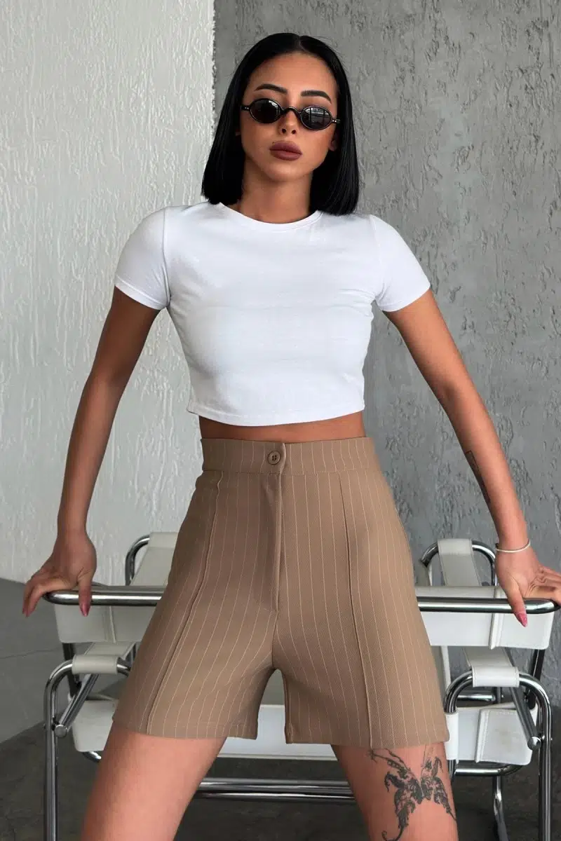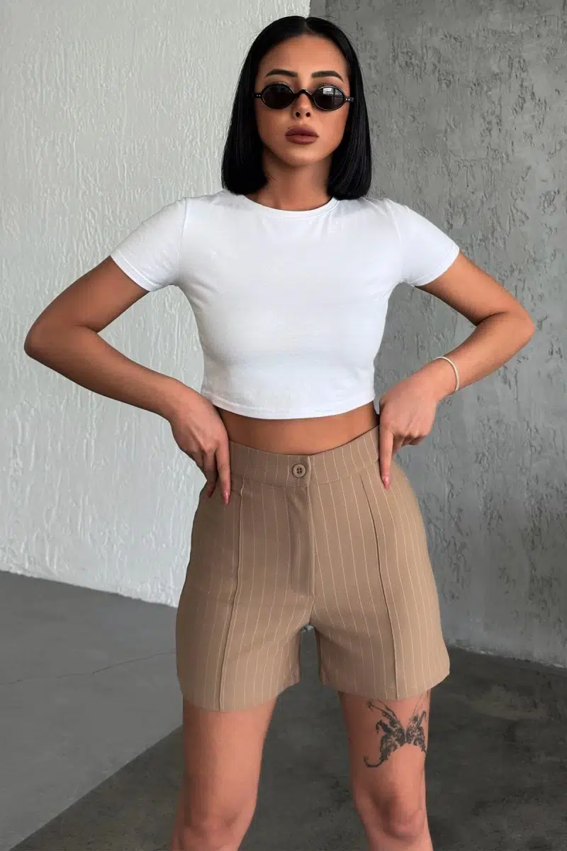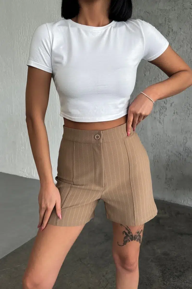 Zarif ve Şıklığı Bir Arada Sunan Yüksek Bel Krep Esnek Çimalı Çizgili Şort Bej