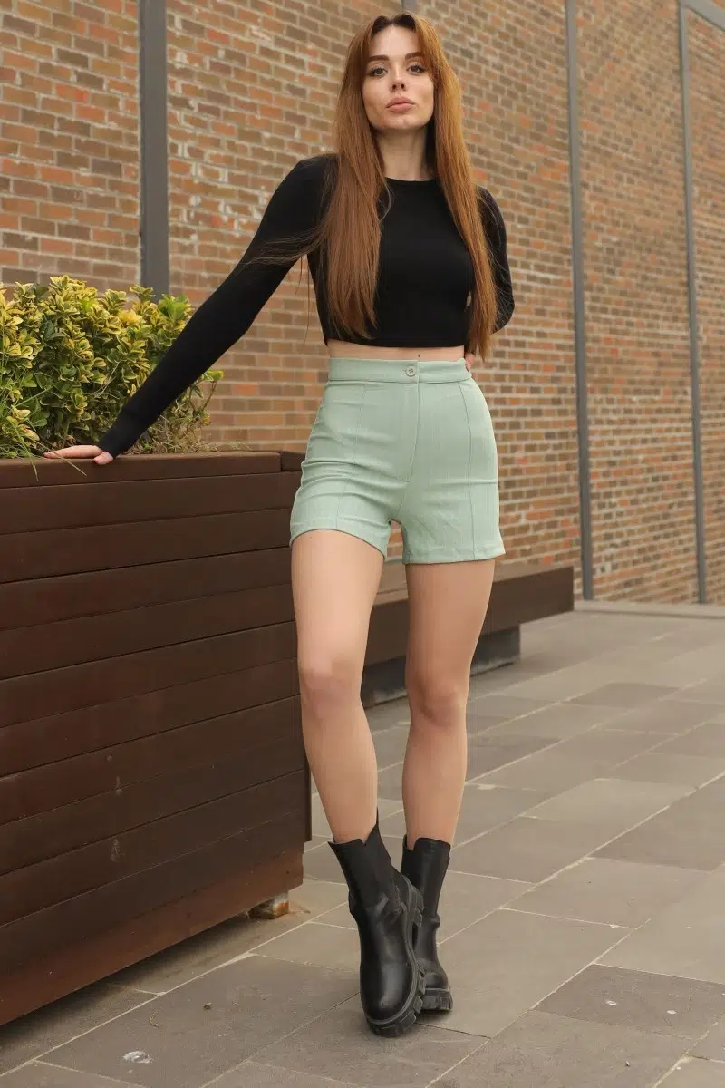 Zarif Ve Şıklığı Bir Arada Sunan Yüksek Bel Krep Esnek Çimalı Çizgili Şort Su Yeşili