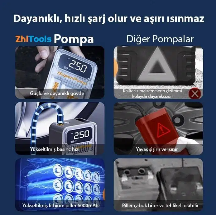 Uzun pil ömrü dahili büyük kapasiteli pil, tam şarjla 4 araba lastiğini şişirmek için tasarlanmıştır